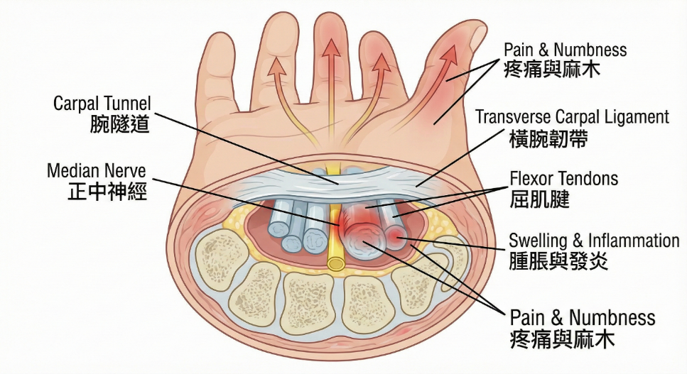 腕隧道是由腕骨與上方的「橫腕韌帶」構成的一個骨性纖維管道。正中神經、九條肌腱與血管都通過這個空間有限的通道。當管道內的壓力因各種因素增加,壓迫到正中神經時,便會引發 CTS。