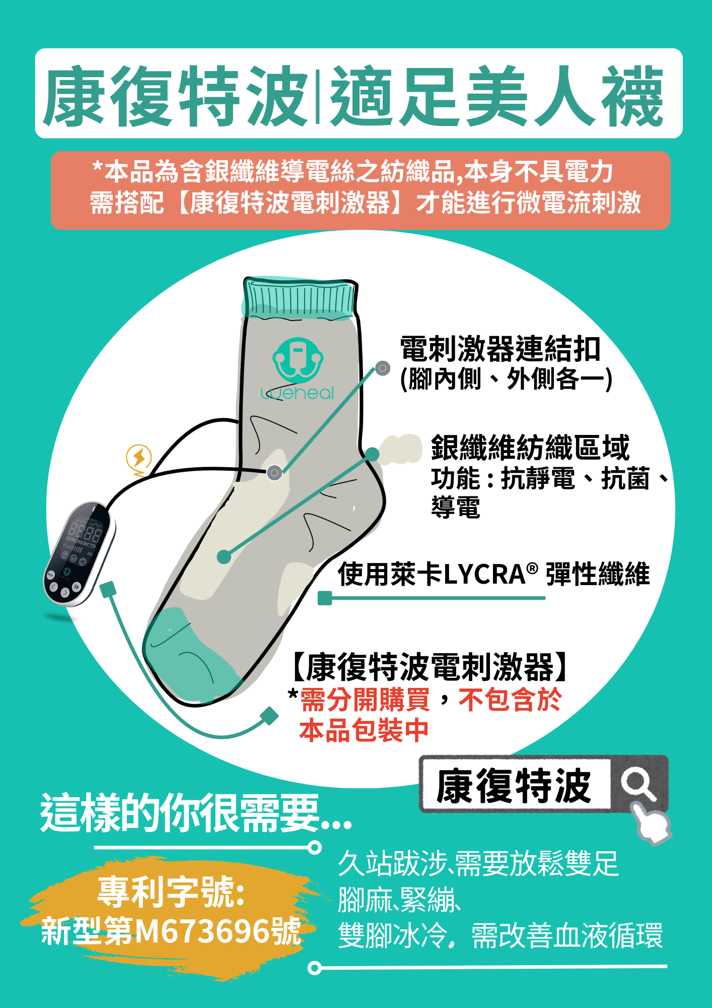 此外,康復特波專家群也針對足部的治療,開發出適足美人襪,搭配康復特波電刺激器可快速有像緩解足部疲勞、促進血液循環、放鬆肌筋膜。有許多登山及高強度運動使用者及足底筋膜炎患者使用後,效果顯著。